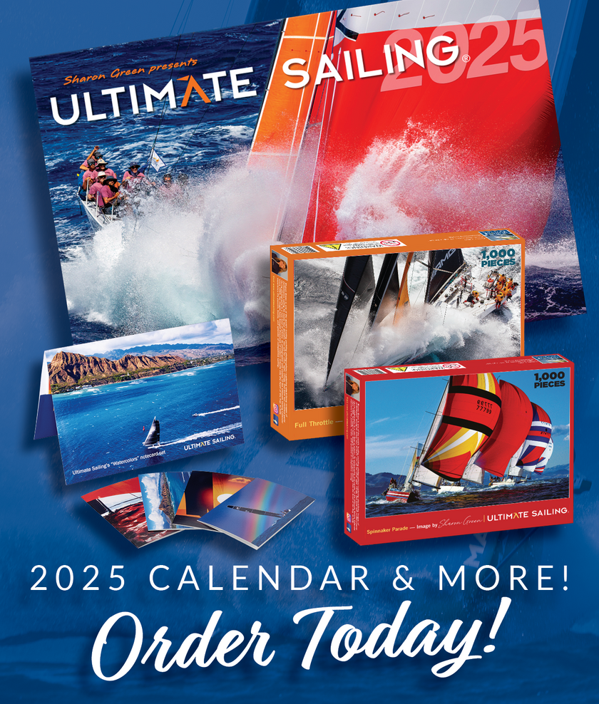 Oh, that water! That sparkling, rich royal blue that caresses the yachts as they hurtle toward Honolulu on the Transpacific Yacht Race, as depicted in the April 2025 pages of the Ultimate Sailing Calendar.